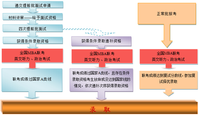 登录中国人民大学商学院MBA项目中心网站“考生服务系统”,按照规定时间提交网上申请及书面申请材料,学院将组织专家评审申请材料,择优给予提前面试资格并组织面试。面试后获得条件录取资格和条件录取递补资格的考生需参加2016年1月举行的全国联考。
